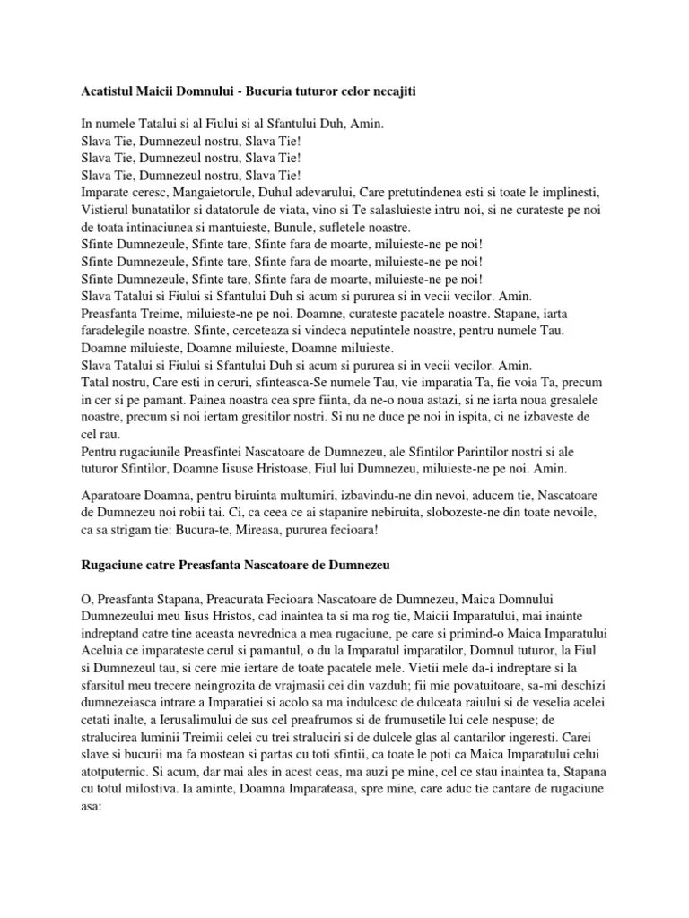 Iară tu, maica domnului, tuturor le dai după trebuinţa fiecăruia, neîmpuţinat, darurile milostivirii tale. Imparate ceresc, mangaietorule, duhul adevarului, care pretutindenea esti si toate le implinesti, vistierul bunatatilor si datatorule de viata, vino si te salasluieste intru noi, si … Iară tu, maica domnului, tuturor le dai după trebuinţa fiecăruia, neîmpuţinat, darurile milostivirii tale. 03/04/2014 · acatist la icoana maicii domnului „grabnic ajutătoare" de la mănăstirea lainici condacul 1 cinepoate povesti mulțimea minunilor tale și care minte poate pătrunde adâncul tainelor dumnezeiești ?.. Caută cu milostivire, preacurată, spre cei ce te cinstesc pe tine, aducând domnului jertfa cântărilor de: